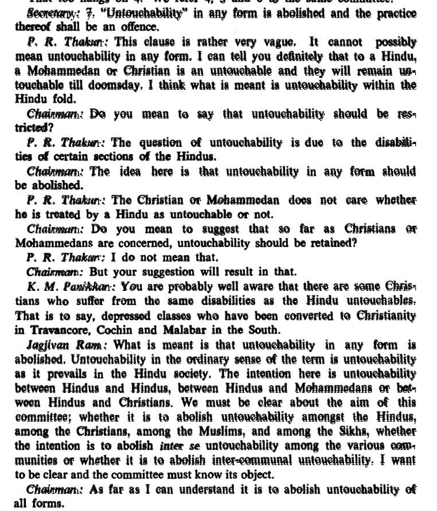 P.R. Thakur is interrogated by other members of the committee, chief among them the Chairman, Sardar Patel, who asks him if he wants to retain untouchability in so far as Muslims and Christians are concerned. P.R. Thakur, in this moment, demurs and says, “I do not mean that”. K.M. Panikkar chimes in to point out that some Christians suffer from the same disabilities as Hindu untouchables and provides examples of depressed classes who have been converted to Christianity in Travancore, Cochin and Malabar.