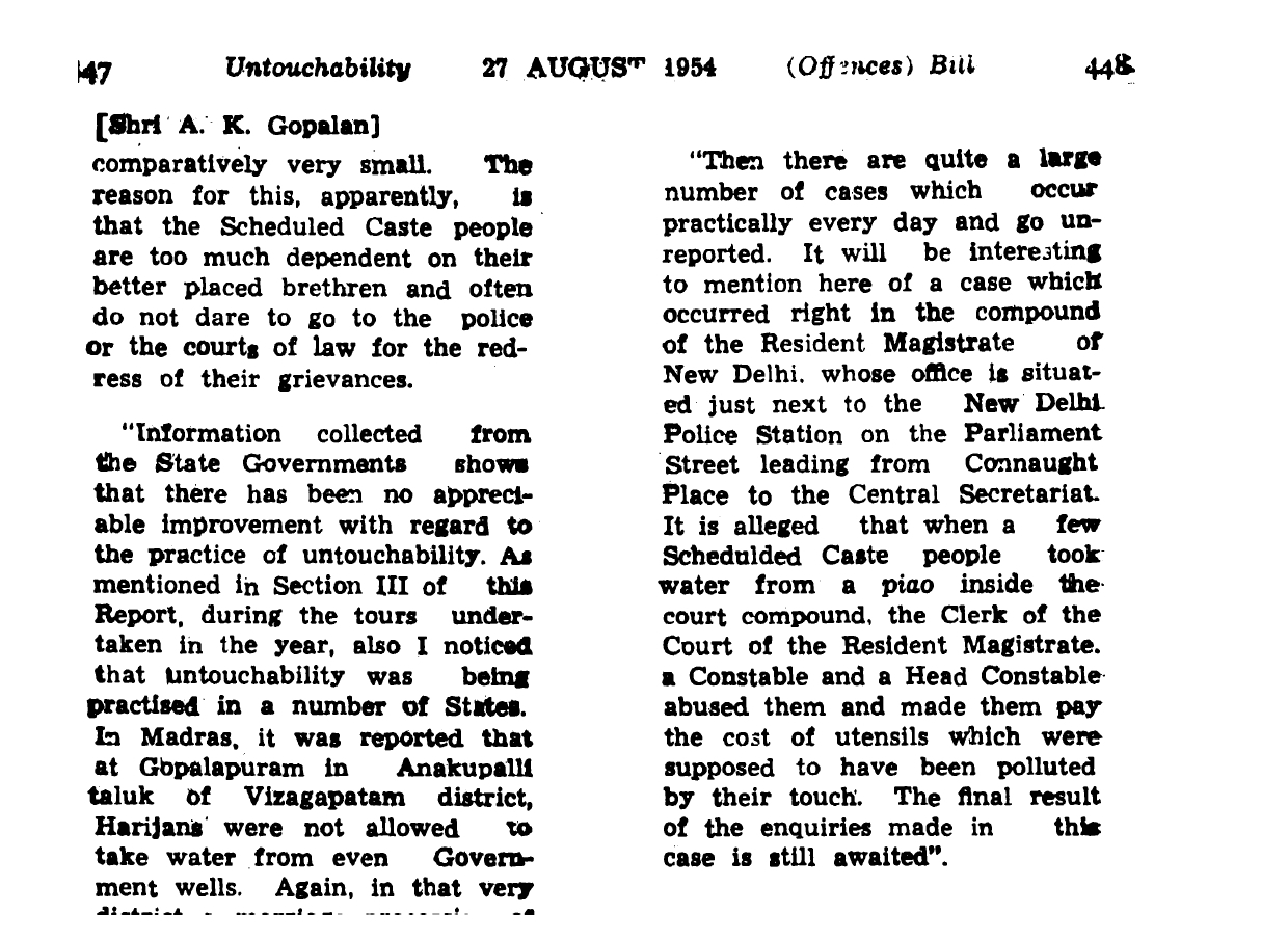 This sentiment was only echoed by T.S.A Chettiar.[10] Other members of parliament, including A.K Gopalan,[11] Laskar, M.B. Vaishya,[12] and Sardar Hukam Chand[13] repeatedly reminded the government that untouchability thrived in their own backyard, citing instances of Dalits being subjected to untouchability in the offices of a Magistrate in New Delhi, on Parliament Street.